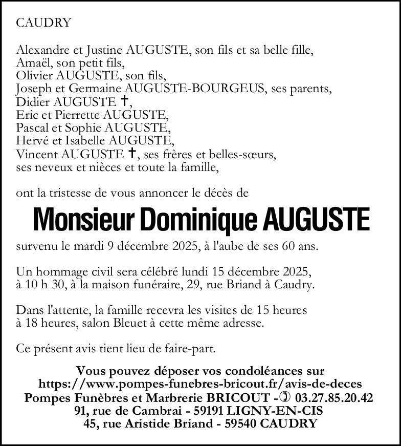 C’est avec une grande tristesse que nous vous annonçons le décès de Dominique AUGUSTE survenu le mardi 09 décembre 2025 à Caudry. La cérémonie se déroulera le lundi 15 décembre 2025 à 10h30 à l’adresse suivante : Funérarium de Caudry - 29 rue Aristide Briand - 59540 Caudry.