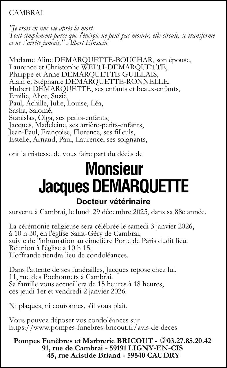 C’est avec une grande tristesse que nous vous annonçons le décès de Jacques DEMARQUETTE survenu le lundi 29 décembre 2025 à Cambrai.