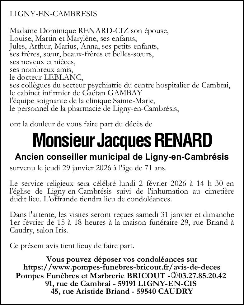 C’est avec une grande tristesse que nous vous annonçons le décès de Jacques RENARD survenu le jeudi 29 janvier 2026 à Cambrai. La cérémonie se déroulera le lundi 02 février 2026 à 14h00 à l’adresse suivante : .