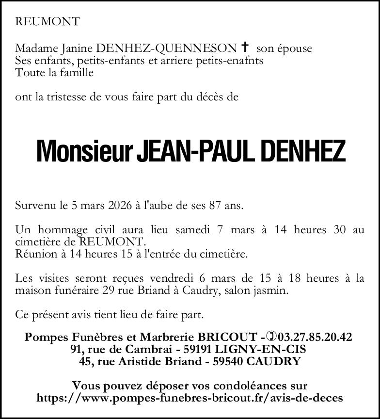 C’est avec une grande tristesse que nous vous annonçons le décès de Jean-Paul DENHEZ survenu le jeudi 05 mars 2026 à Caudry. La cérémonie se déroulera le samedi 07 mars 2026 à 14h30 à l’adresse suivante : Cimetière de Reumont - Rue de l'Église - 59980 Reumont.