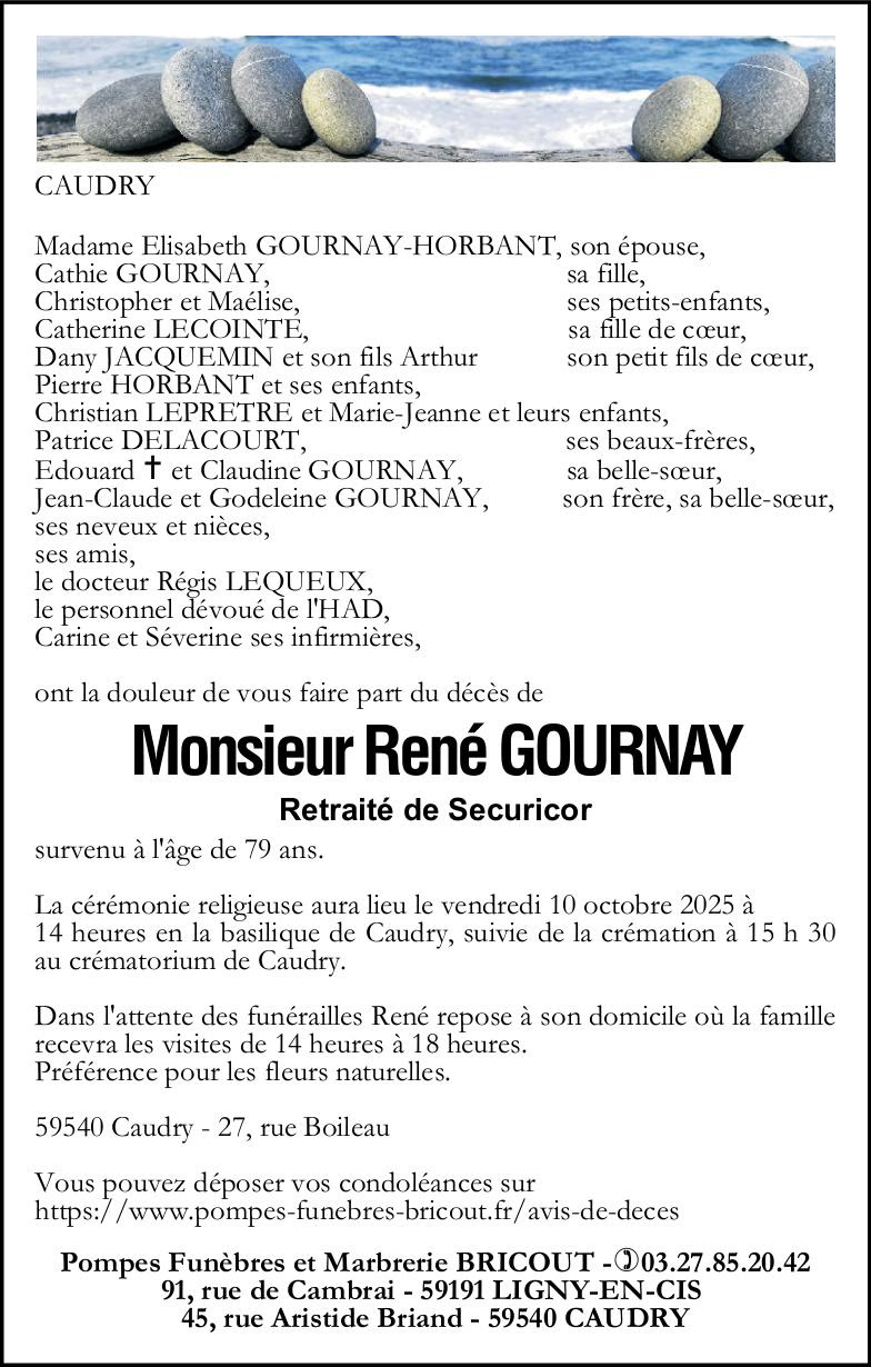 C’est avec une grande tristesse que nous vous annonçons le décès de René GOURNAY survenu le dimanche 05 octobre 2025 à Caudry.
