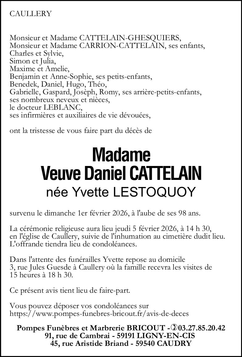 C’est avec une grande tristesse que nous vous annonçons le décès d’Yvette CATTELAIN survenu le dimanche 01 février 2026 à Cambrai. La cérémonie se déroulera le jeudi 05 février 2026 à 14h30 à l’adresse suivante : Caullery Église - 59191 Caullery.